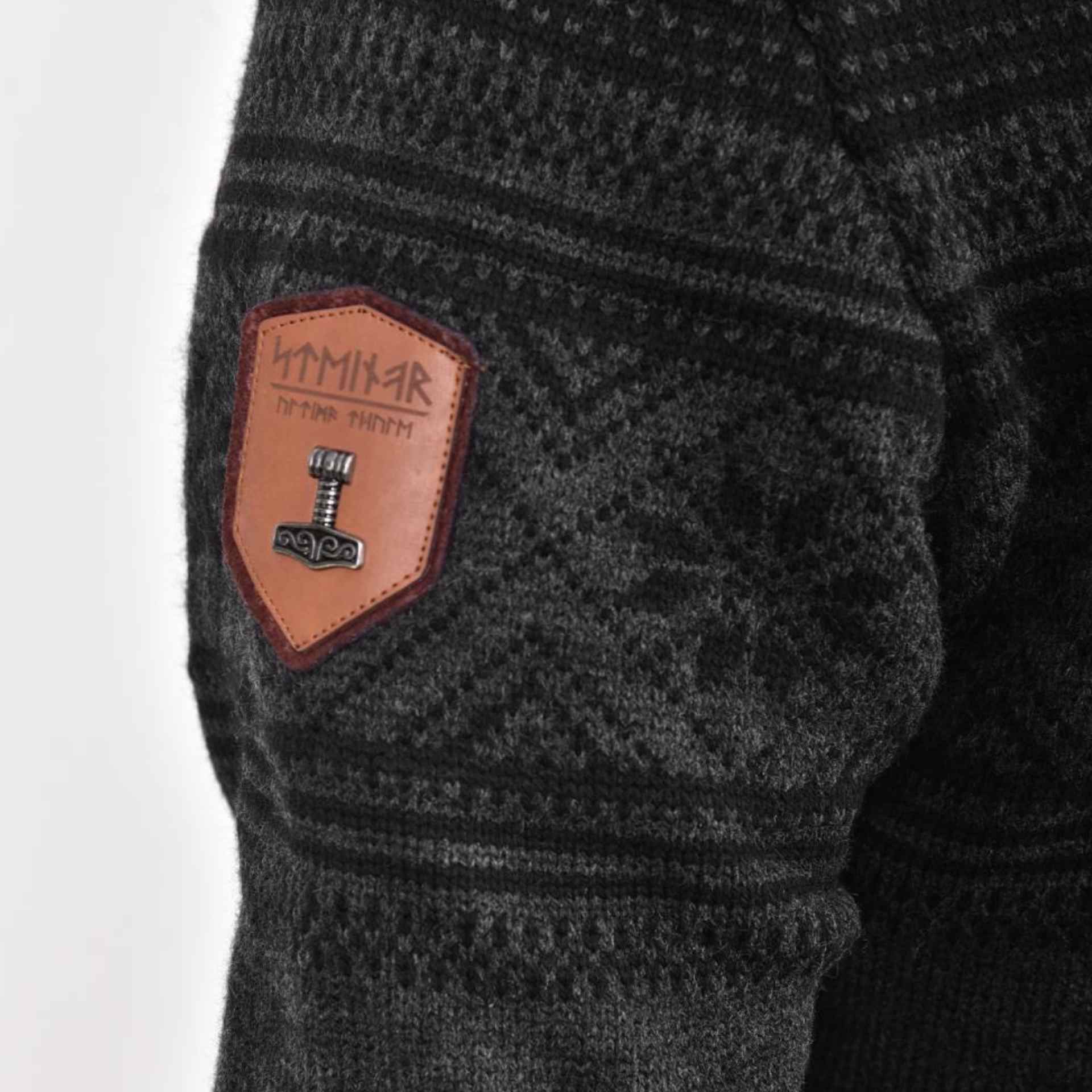 Eingewebte TYR-Runenschrift auf Front und Rücken sowie ein Patch mit Metall-Thorshammer am Ärmel.